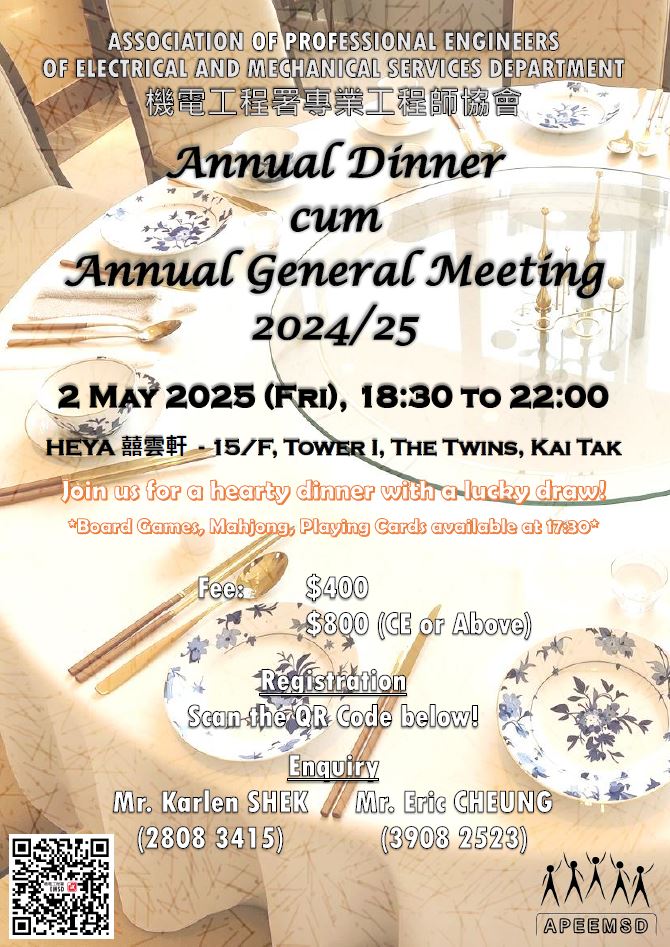 You are cordially invited to attend the Annual Dinner cum Annual General Meeting 2024/25 to be held on 2 May 2025 (Friday) at HEYA 囍雲軒, 15/F, Tower I, The Twins, Kai Tak.